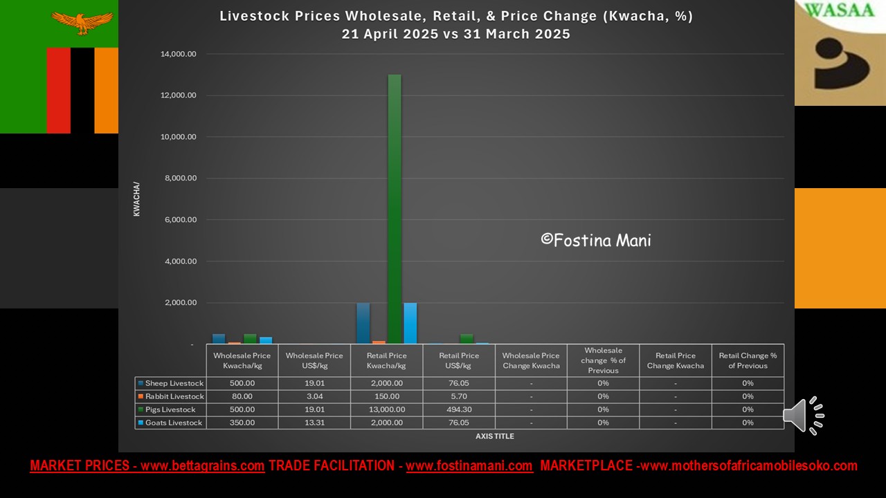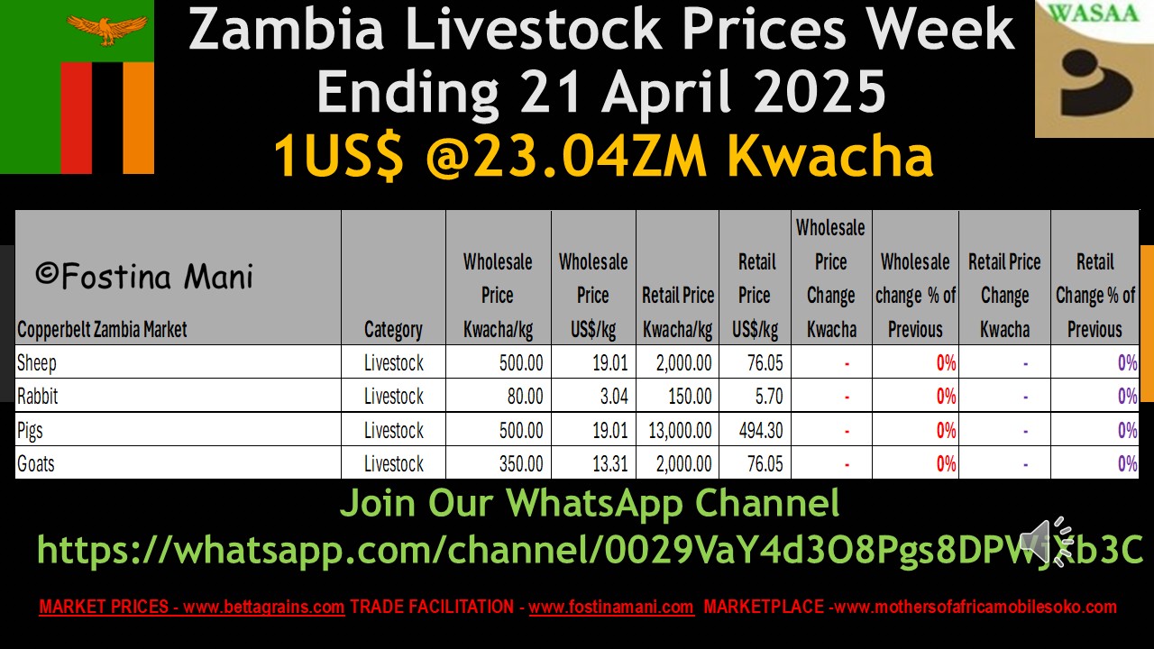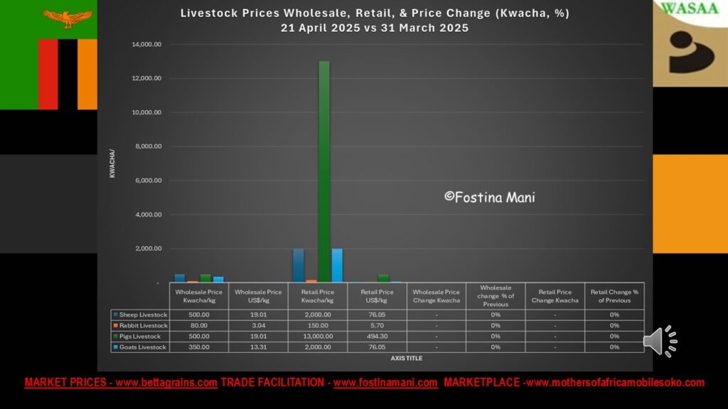 Livestock prices as of 21 April 2025 in Comparison to 31 March 2025 remained the same for Sheep, Rabbit, Pigs, and Goats.