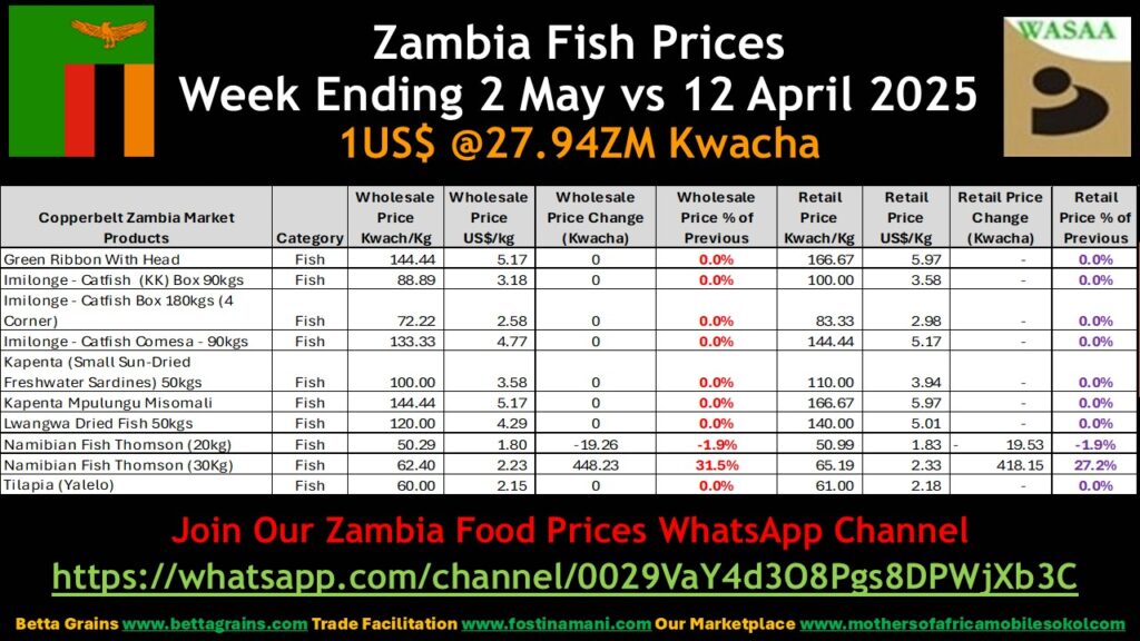 Fish prices remained the same except for the Namibian Fish Thomson 20kg whose wholesale price dropped by 19.26Kwach -1.9% and a retail price drop of 19.53 Kwacha -1.9%. Namibian Fish Thomson 30kg Wholesale price increased by 448.23 Kwach a 31.5% increase and a retail price increase of 418.15 27.2%. Full Details https://youtu.be/qvmLcaVvFtg