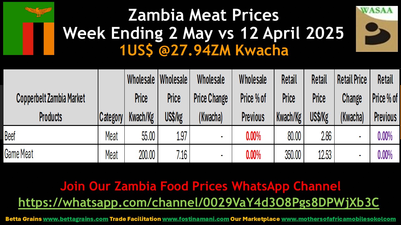 Zambia Meat Prices Comparison 2 May vs 12 April 2025 Posted on January 14, 2026 by Fostina Mani There were no price changes in both the wholesale and retail meat prices. Full Details https://youtu.be/qvmLcaVvFtg