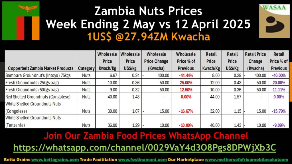 Bambara Nuts Wholesale and Retail price dropped by 400 Kwacha a -44.44% and -40.00% change in wholesale and retail price respectively. Fresh Groundnuts 25kg Bag price increased by 50 Kwacha both the wholesale and retail a 25% and 20% increase for the wholesale and retail prices respectively. Fresh Groundnuts 50jg Bag prices also increased by 50 Kwacha both the wholesale and retail a 12.50% and 11.11% increase for the wholesale and retail prices respectively. There were no changes in the Congolese Red Shelled Groundnuts. The Congolese White Shelled Groundnuts both the wholesale and retail prices decreased by 15Kwacha a 16.67% and 15.79% drop for the wholesale and retail prices respectively. The Tanzania White Shelled Groundnuts wholesale and retail prices dropped by 10Kwacha a 10% and 9.09% drop on the wholesale and retail prices respectively.