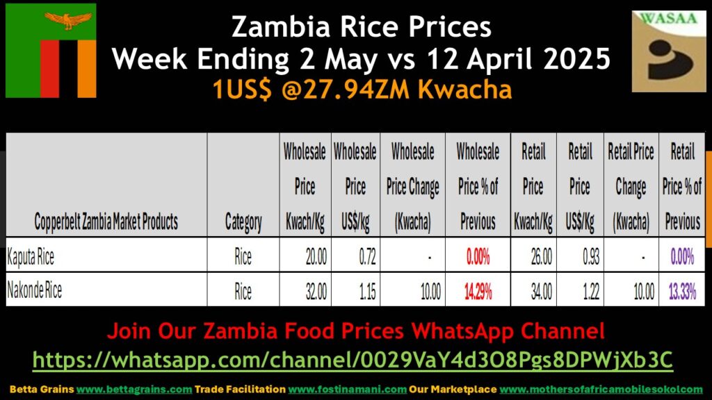 The Wholesale and Retail price of Nakonde Rice increased by 10 Kwacha a 14.29% and 13.33% increase on both Wholesale and Retail prices respectively.