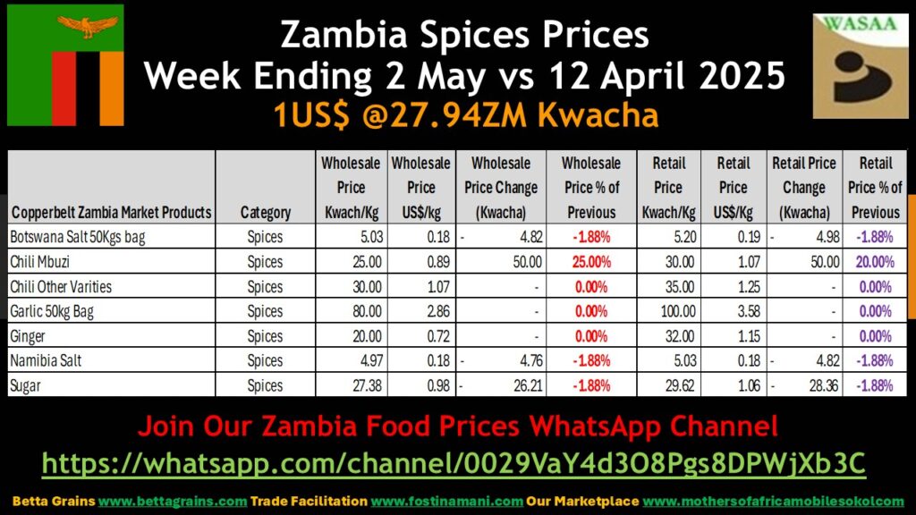 The price of Galic, Ginger, and most varieties of chilies remained unchanged for both the wholesale and retail prices. Except Chili Mbuzi wholesale and retail price which increased by 50Kwach for both the wholesale and retail. A 25% and 20% price increase respectively. Botswana Salt 50Kg Bag decreased by 4.82Kwacha (-1.88%) on the Wholesale price and 4.98 Kwacha (-1.88%) on the retail price. The changes were mostly US$/Kwacha foreign exchange rate. The price of Namibia Salt dropped by 4.76 Kwacha (-1.88%) on the Wholesale Price and a drop of 4.82 (-1.88%) on the Retail Price. The price of Sugar dropped by 26.21 Kwacha (-1.88%) on the Wholesale Price and a drop of 28.36Kwacha (-1.88%) on the Retail Price.